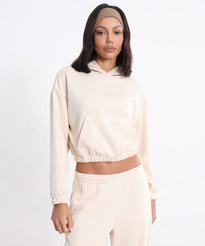 - Buzo tipo hoodie confeccionado en tejido plush de textura aterciopelada que aporta suavidad y calidez.