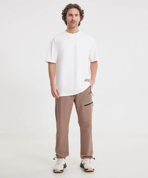 - Jogger de bolsillos laterales con cierre, tiro alto, pretina resortada con cordón y silueta semiajustada, con botas ajustables al tobillo.