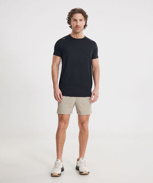 - Short running medio con calzoncillo interno, pretina resortada, bolsillos con cierres, textura lisa, silueta regular, aberturas en los costados.